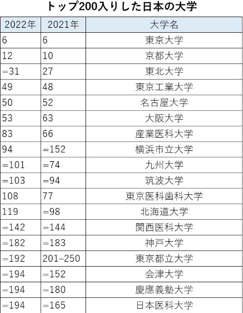 今年挺进前200名的一共有18所日本大学,不得不说与2021年的排名相比,很多日本大学有退步趋势,但好消息是也有三所大学进步明显,实现了排名的“大跃进”。