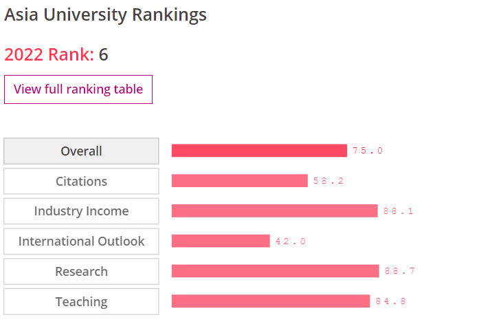 从泰晤士高等教育世界大学排名的官网可以看到东京大学的强势绩效指标分别是行业收入、研究和教学,均超过80分。这反映出东京大学在亚洲甚至世界范围内的良好声誉,其主要弱点是国际视野。