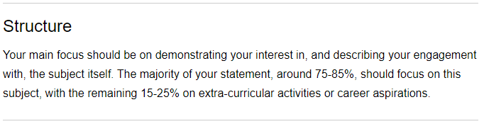 结构方面:UCL建议75%-85%的内容侧重于学生对学科本身的兴趣以及相关的经历,15%-25%的内容要涵盖课外活动或就业抱负。