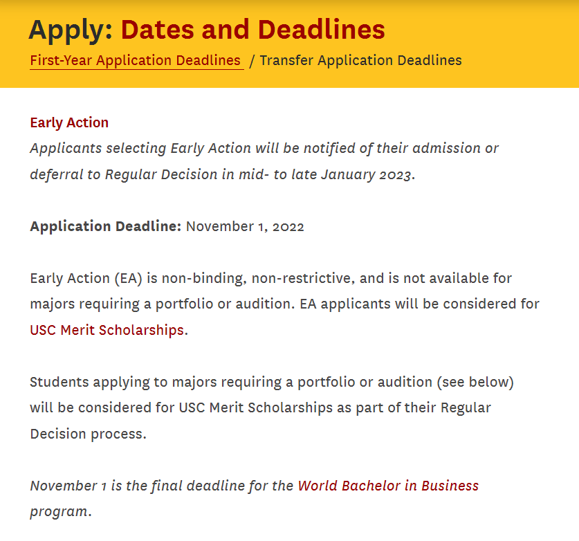 对于南加大大部分专业,RD的截止日期是2023年1月15日,RD阶段的申请者和被延迟至RD阶段的EA申请者都将在2023年4月1日收到录取结果。