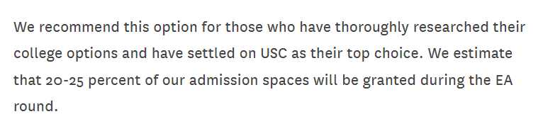 对于那些已经有明确的选校列表,并视南加大为首选的学生,我们强烈建议他们在EA阶段提交申请。我们预计总录取名额中的 20-25% 将会给到EA阶段的申请人。