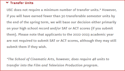南加州大学转学虽然没有最低学分要求,但是如果可转学分少于30,就需要参考高中成绩或SAT/ACT成绩,另外电影和电视制作专业需要48个学分↓