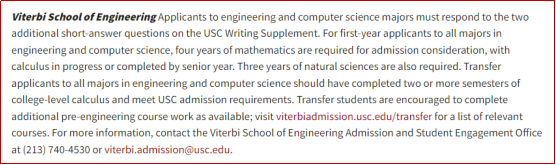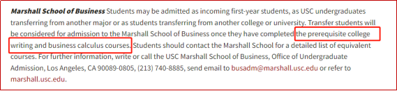 马歇尔商学院要求转学生修过大学写作和商业微积分,工程学院要求至少两个学期的微积分,艺术相关专业需要提交相关作品集。
