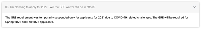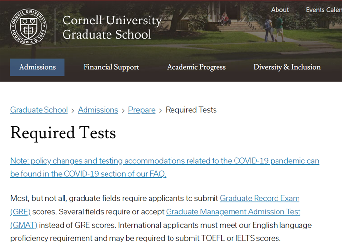 康奈尔大学硕士招生官网显示,2022年春季和秋季入学周期将继续实行GRE/GMAT可选择提交政策。但是项目要求中也明确提出,在没有GRE/GMAT等标化成绩的情况下,招生委员会将通过加强审查其他申请材料来评估学生的学术能力。