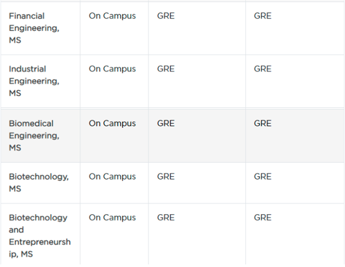 纽约大学除了 Computer Science(计算机科学), Electrical Engineering(电子工程), Financial Engineering(金融工程)明确要求需要提交GRE成绩之外,工程学院的生物技术理学硕士 (Biotechnology) 相关专业也明确GRE成绩要求。