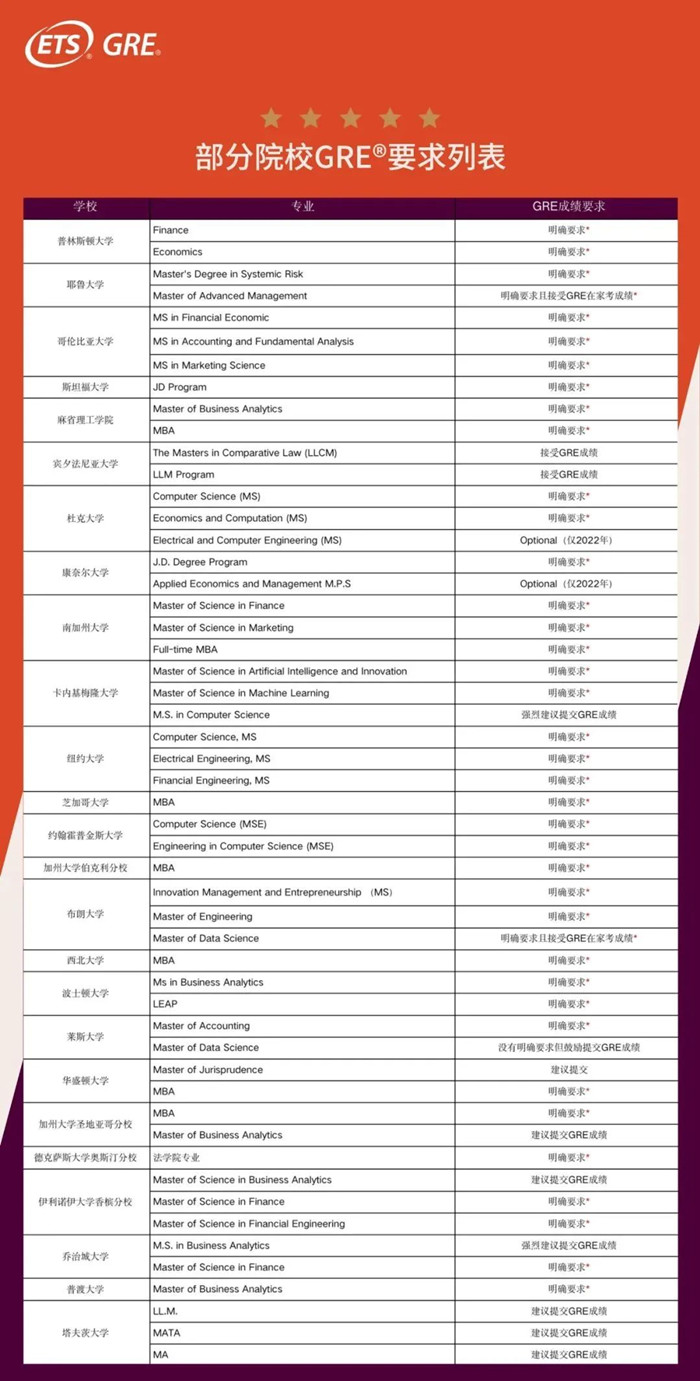 同时,ETS官方也总结了上一个申请季部分院校对GRE成绩的要求: