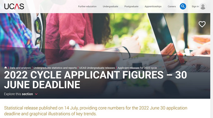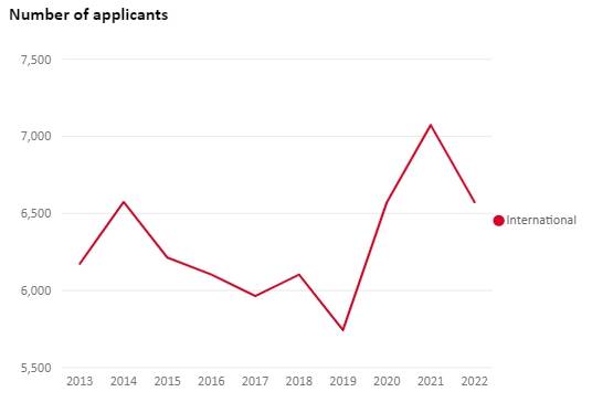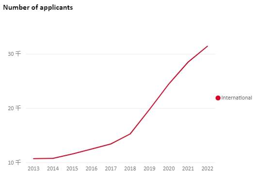根据UCAS最新发布的申请数据,2022年中国大陆通过UCAS申请英国本科的学生人数共31,400人,比上个申请季增加2910人,增长10%,申请人数是2018年的两倍(截止2020年6月30日)。