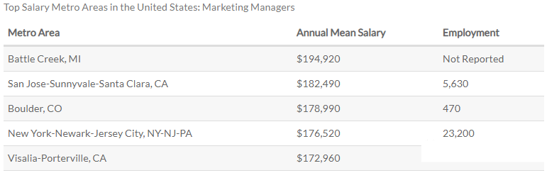 咱们以平均薪资水平最 高的市场经理为例,就业薪资高的城市包括:圣克拉拉、博尔德、纽约等,高达17万美元+。