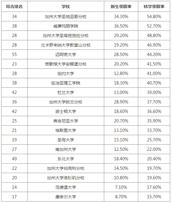 需要注意的是,上面的学校里比如加州大学系、弗吉尼亚、北卡等公立大学,和当地的社区大学都有相关协议,会录取不少社区转学生,所以看上去录取率高但对于国际学生来说难度并不低!