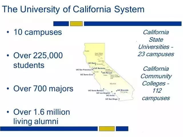 加利福尼亚大学(University of California),简称加州大学,是位于美国加州的一个由10所公立大学组成的大学行政系统,是世界上最具影响力的公立大学系统,被誉为“公立高等教育的典范”。那么加州大学的分校有哪些?下面由小编给大家详细介绍一下,欢迎大家阅读参考。