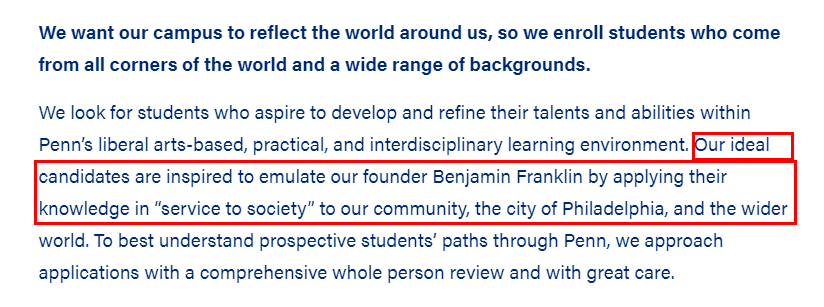十年前,宾夕法尼亚大学喜欢那些 有好奇心、上进心、有毅力的学生,并且这些学生都希望能够 为宾大和整个社会做出贡献。这些录取标准从未改变,一直到今天宾大还是在寻找这样的学生。这些特质在宾大的官网上也一直被提及到: