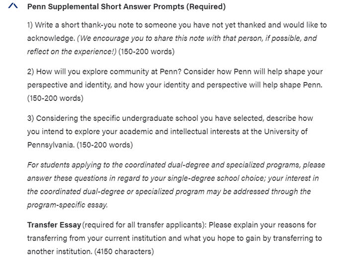 宾大的补充essay题目由两道题变成了三道题,这三道题目是新生申请宾大本科学院(包括文理学院,工程学院,沃顿商学院,护理学院)都必须要回答的问题。