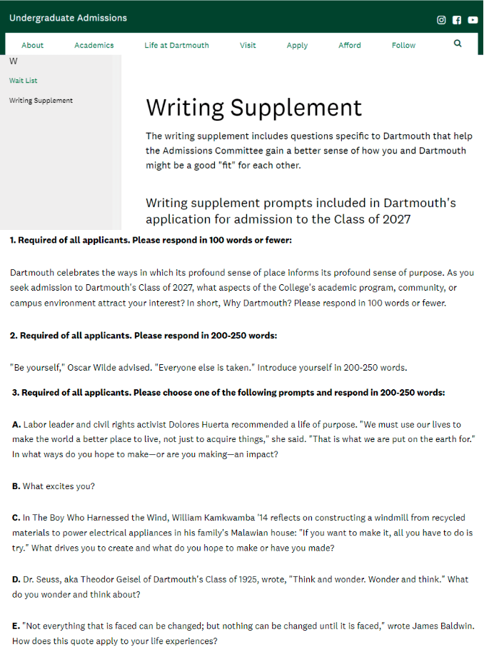 在2022-2023申请中,达特茅斯学院补充essay有3道必答题目,比去年增加了一个题目。第三道题目由去年的6选1变为了5选1,题目内容也发生了变化。