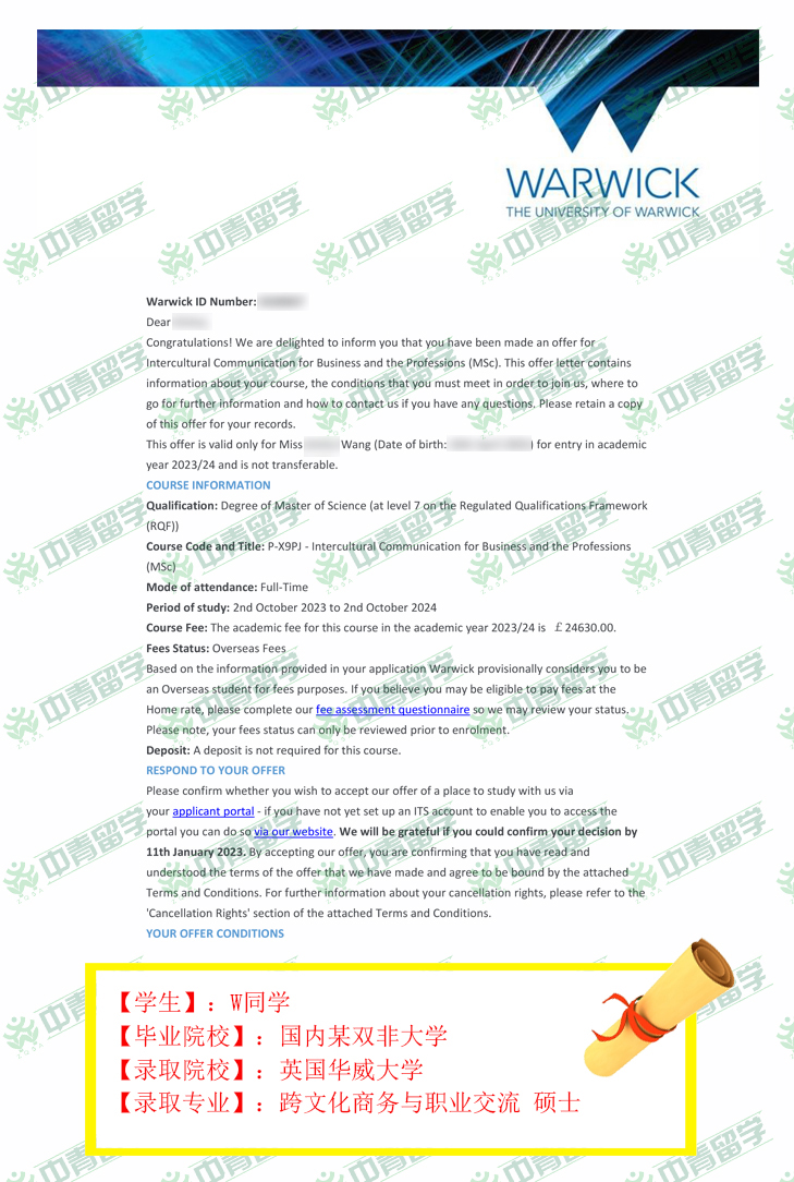 【录取院校】:英国华威大学