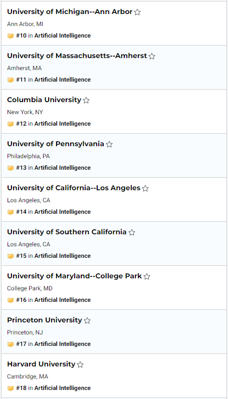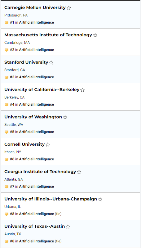 AI专业排名前20的美国大学: