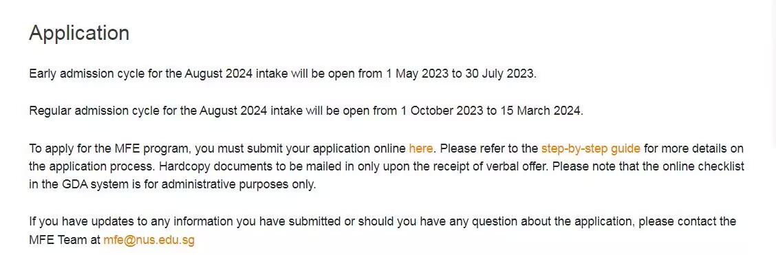 新加坡国立大学(NUS)金融工程硕士(MFE)2024提前批将于5月1日正式启动,并于7月30日停止接受申请!去年提前批开放申请的时间是5月3日,今年开放时间稍有提前。同时,NUS MFE也公布了2024常规批申请时间,10月1日开放,2024年3月15日截止。