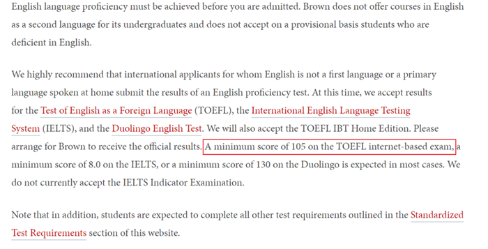 而藤校之一的布朗大学也提高了国际学生的申请门槛:由去年的托福最 低100分调整为最 低分105分。