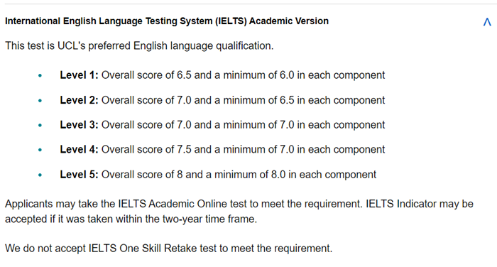 UCL可以接受线上雅思考试,但不接受雅思单科重考,具体等级要求如下: