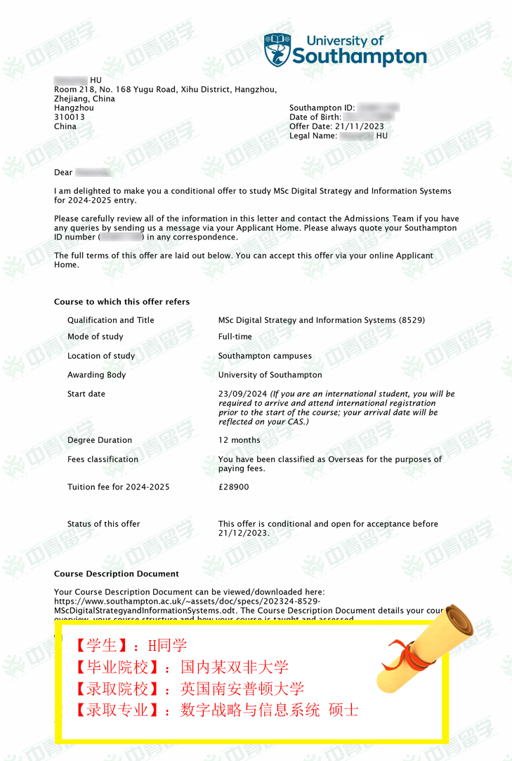【录取院校】:英国南安普顿大学