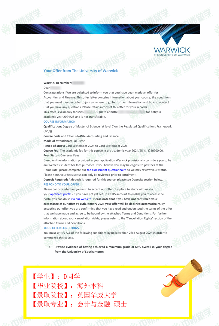 【录取院校】:英国华威大学