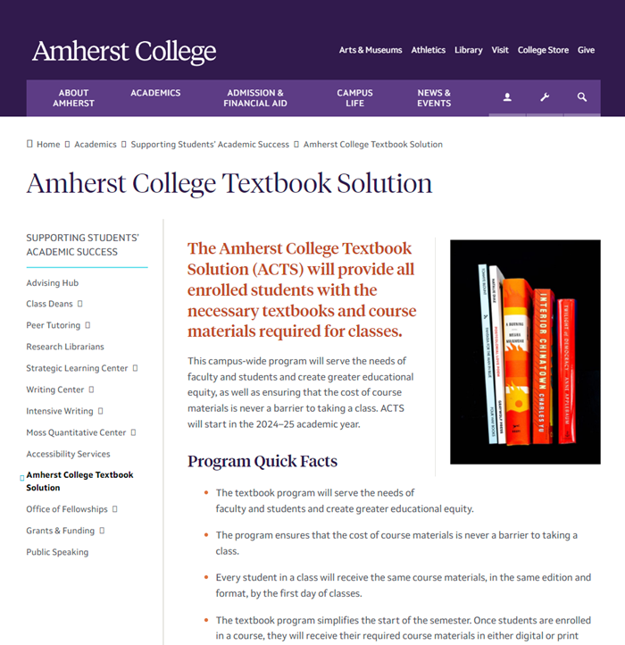 为了创造更加公平的教育环境,并确保课程材料成本支出不会成为教育障碍,阿默斯特学院宣布,将从2024-25学年开始为全校所有学生提供所有所修课程所需的教材。