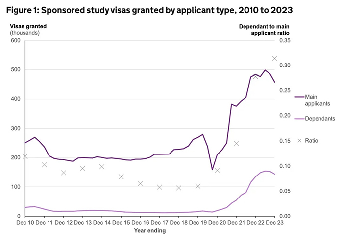 为了减少净移民数,英国政府此前宣布了包括大幅提高工作签证(Skilled Worker visa)最低年薪、限制家属陪伴、重新评估毕业生签证(不排除取消或限制)等大幅限制移民的一系列收紧政策。