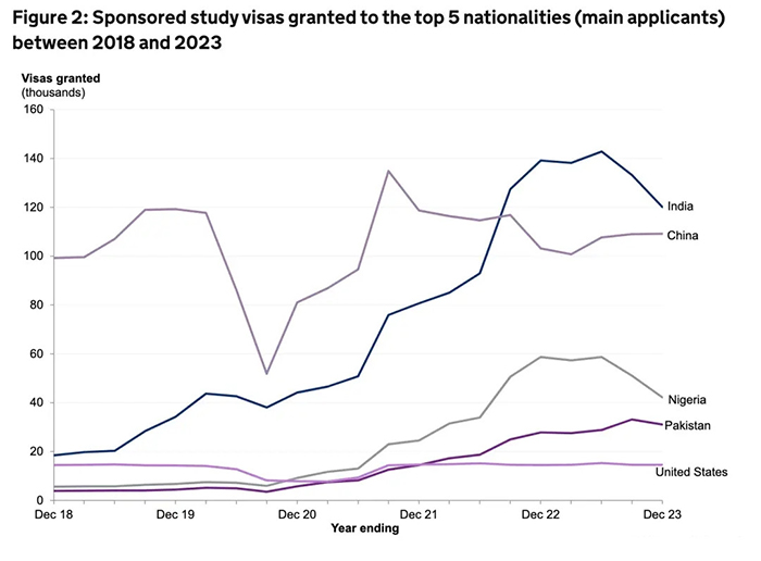 最新统计数据显示,2023 年,印度和中国分别占留学签证总数的 26% 和 24% 。这也是继2022 年之后,印度再次超越中国,成为英国留学最大生源国。