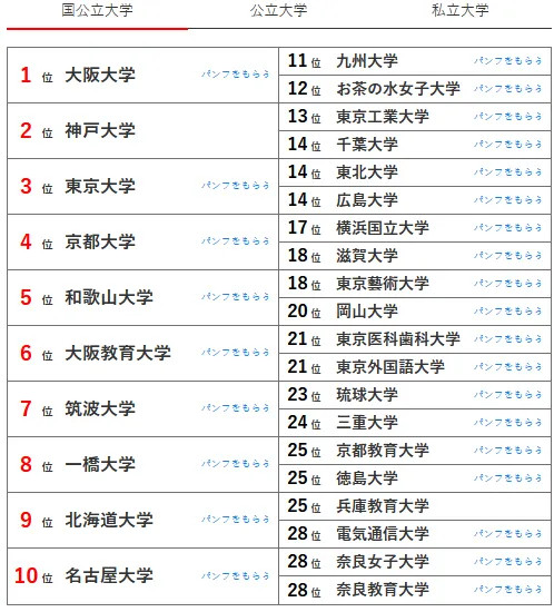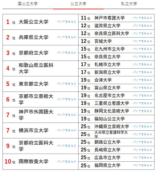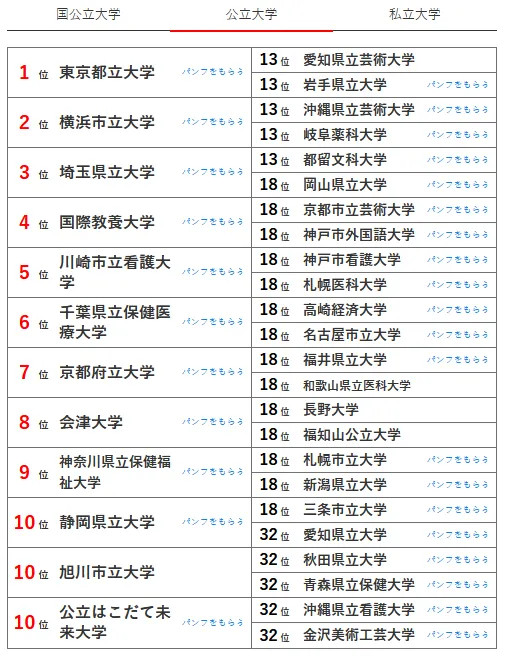第十名并列3所大学,分别是静冈县立大学(静岡県静岡市)、旭川市立大学(北海道中核市)、公立函馆未来大学(北海道函馆市)。