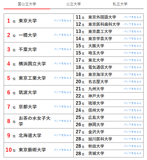 在东京地区的高中生中,国立大学最受欢迎的大学毋庸置疑是在亚洲都享有学术盛誉的东京大学(东京都文京区);