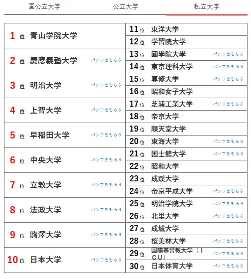 在私立大学中,第一名是青山学院大学(东京都涩谷区);