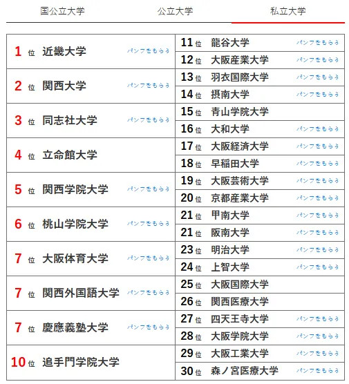 私立大学中,人气第一名的是近畿大学(大阪府东大阪市);