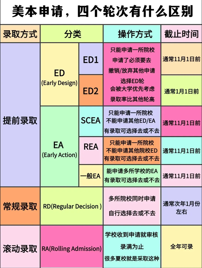 美国大学的申请轮次包含提前录取(ED)、提前申请(EA)、常规录取(RD),滚动录取(Rolling Admission)。我们具体来拆解下每个批次的不同要求,如果看着有点晕,可以看图帮助理解: