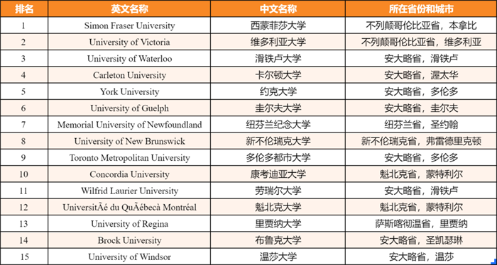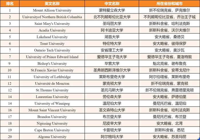 其中湖首大学排名暴涨6位,从去年的11名一跃升至今年Top5,成为今年排名最大黑马;爱德华王子岛大学则上升3名,排在第7。