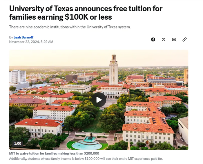 此外,德州大学系统(UT)也于近期宣布将扩大其低收入家庭免学费计划,将年收入在10万美元或以下的家庭全部纳入该项目。