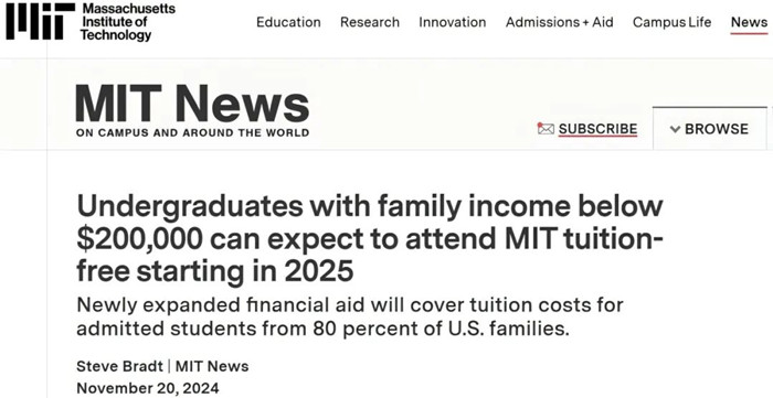 得益于校友和其他渠道的慷慨捐赠,麻省理工这次免学费计划不仅惠及了低收入家庭的学生,同时也全面照顾了中产家庭的学生。