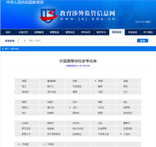 教育部通过教育涉外监管信息网公布了最新的47个中国公民主要留学国家的1万多所学校名单,基本涵盖中国公民主要留学目的地国的正规高校。