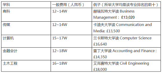 硕士预科跟本科预科的学费差不多,一年1W镑左右。硕士费用跟本科差距不是很大,平均高出2000 ~ 3000镑左右,但是只需一年时间便可完成,性价比很高的说。除部分商科、传媒和医学类较高以外一般平均每年学费在12万到18万之间。