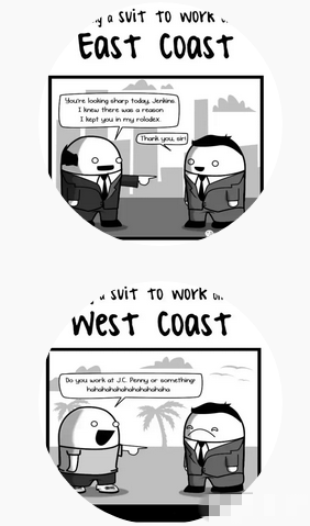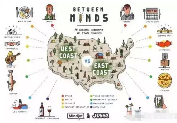 关于Mark Zuckerburg的小插曲在两海岸间创造了媒体风暴,他们讨论东西部的陈规旧习,并想得出一个正确的观点。如果你让美国人描述一下来自东海岸或西海岸的人,对于同样的陈规你常常会听到不同的答案。