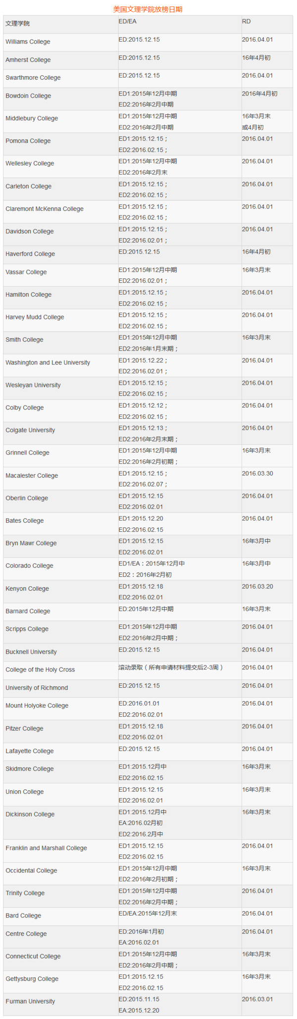 下面小编为大家送上最新的美国综合大学和文理学院2016年ED/EA申请的放榜时间表: