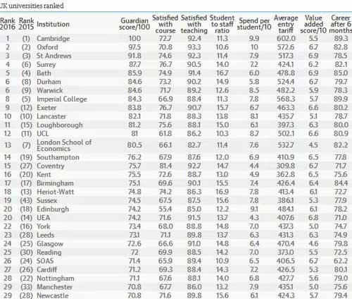 吐槽归吐槽,虽然卫报版英国大学排名主观性比较强,但是毕竟数据都是真实的,权威性还是有的,作为选校时的参考还是可以的。下面一起来看看2016年《卫报》英国大学排名吧!
