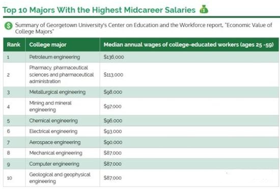 在美国,工程师的工资的确非常可观,尤其是石油工程专业,他们的职业中期工资最高,达到$136,000。但是科学、技术、工程和数学等专业领域的工作也是能获得很好的回报的。U.S.News根据《大学专业的经济价值》报告给出了美国留学赚钱最多的10个专业,来看看有没有你学的专业?