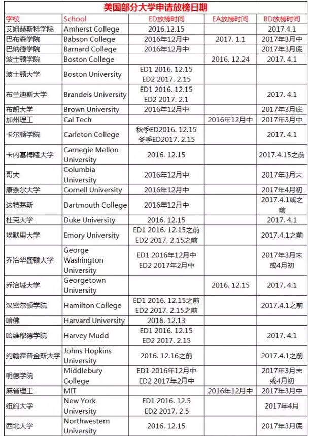 美国大学早申请申请放榜日期多集中在12月中旬左右,常规申请会从3月中持续到4月,部分大学会在放榜日期一周内进行微调。