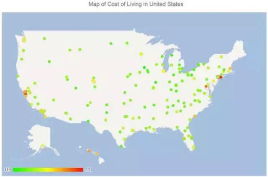 首先,大家对美国各地的消费水平排名有个初步了解,Praice Index(消费指数)越高,生活开销越大。