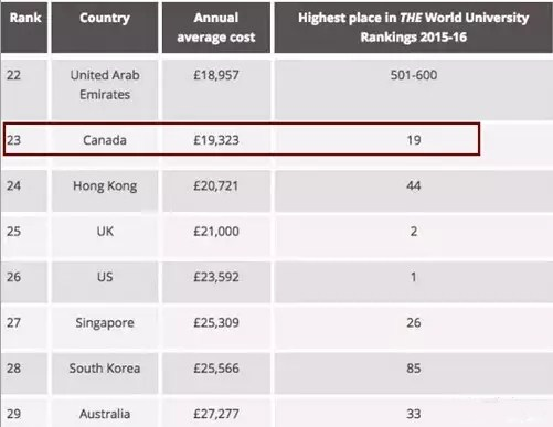 为了能更好地帮助全球国际生选择到最适合自己的留学目标国家,贴心的泰晤士(TIMES)联合FAIRFX(旅行货币兑换公司)就全球国家和地区的留学费用的开销,统计了一个详细的排名榜,其中列举出来全世界29个留学热门国家所需要的留学费用,从数据上可以看出最便宜的留学费用国家为印度,而在发达国家中,加拿大留学费用性价比最高,它虽然属于偏贵的留学国家之列,但是相对于美国、英国和澳洲等几大热门留学国而言,是最低的。