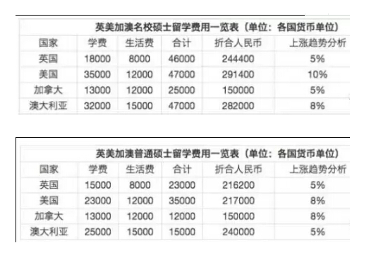 不仅如此,除了最贵留学国家和地区之外,还有一个关于硕士留学费用的研究,分别给出了英国、美国、澳州、加拿大四国名校硕士的平均费用。