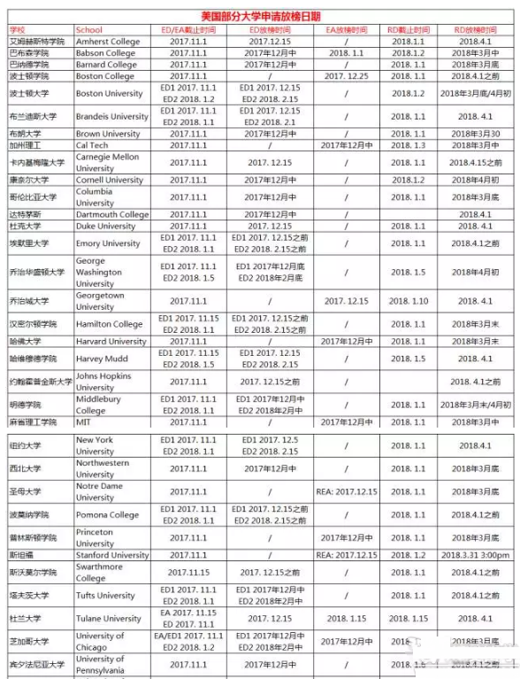 牢记早申请、常规申请等截止日期,至少自己所申请学校的截止日期要烂熟于心。这里有一份美国大学申请截止、放榜日期表:
