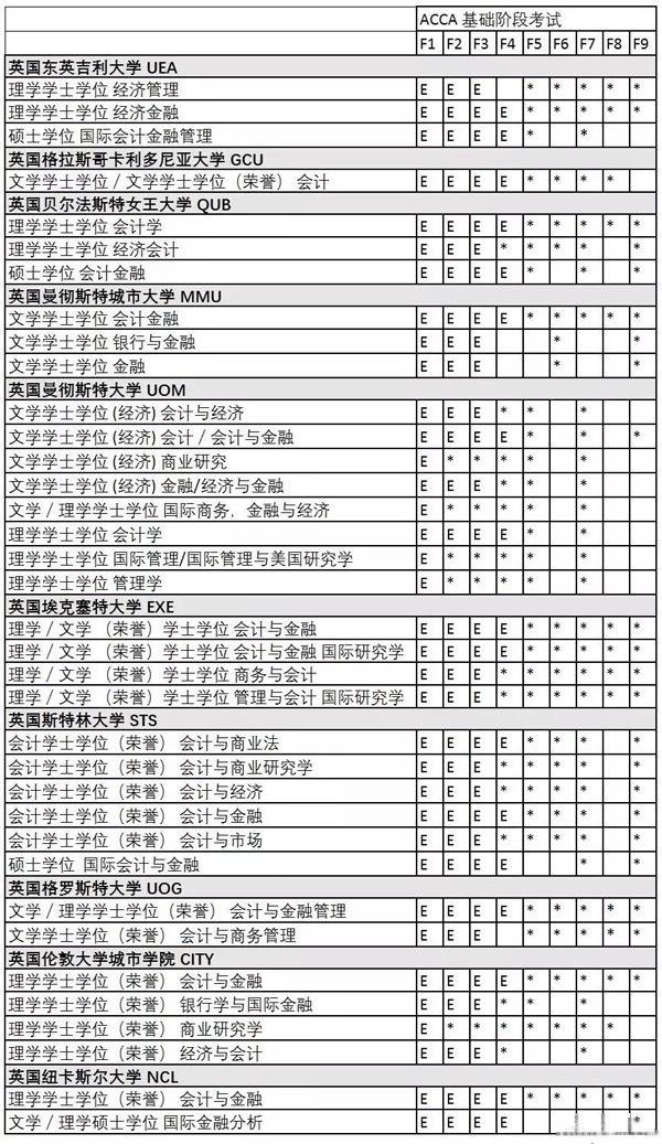 上图E表示课程毕业就能获得的免试科目,*表示需要通过完成选修或指定科目才能免试的科目,空白表示不能免试;