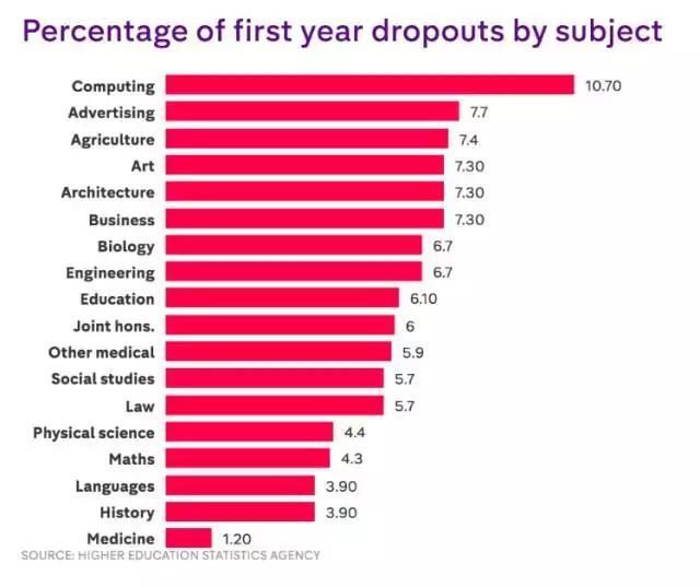 不同的专业的难度和严格程度不一。其中Computer Science的挂科率稳稳地居于榜首,挂科率高达10.7%。