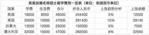 而除了各国的留学费用之外,世界各国名校的硕士留学费用也出现了不同程度的上涨,比如,英美奥加四国的硕士留学费用: