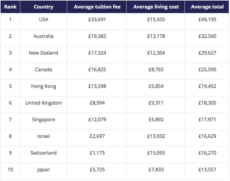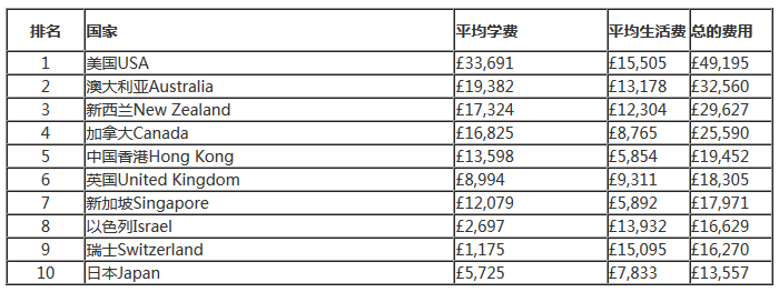 1.美国以平均学费£33,691,总的留学费用在£49,195,成为全球最贵的留学国家;